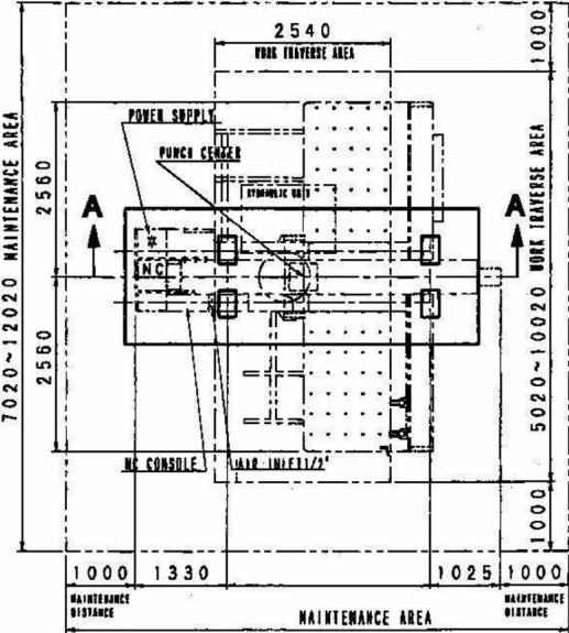 安裝的場所應充分考慮到數(shù)控沖床機器及材料的移動、材料的搬進及搬出、以及數(shù)控沖床機器及其它裝置的保養(yǎng)檢查等之作業(yè),同時在數(shù)控沖床及其它的裝置之周圍應預留充分的空間。 空氣壓縮裝置應放置在離機床不超過5米遠的地方。安裝的場所應遠離易產(chǎn)生灰塵或粉末的機器。雖然機床具在防電磁干擾的功能,但足也應該離開焊接機、鉆床、噴砂機、以及研磨機等易于產(chǎn)生電源噪音的機器3米以下的距離。需要提供堅實、水平的混凝十地基(600mm厚)安裝數(shù)控沖床。地基圖山AMADA提供。