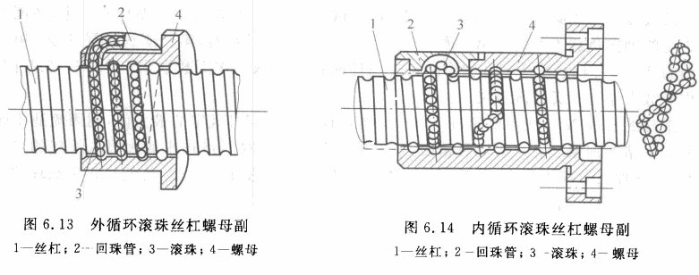 數控沖床滾珠絲杠副可分為內循環(huán)及外循環(huán)兩類。圖6. 13所示為外循環(huán)螺旋槽式滾珠絲杠劇,在螺母的外圓上鏡有螺旋槽,并在螺母內部裝上擋珠器,擋珠器的舌部切斷螺紋滾道,迫使?jié)L珠流入通向螺旋槽的孔中而完成循環(huán)。圖6. 14所示為內循環(huán)滾珠絲枉副,在螺母外側孔中裝有接通相鄰滾道的反向器,以迫使?jié)L珠翻越絲杠的齒頂而進入相鄰滾道。通常在一個螺母上裝有三個反向器(即采用三列結構),這三個反向器彼此沿螺母圓周相互錯開1200,軸向間隔為4/3-7/3P(P為螺距);有的裝兩個反向器(采用雙列結構),反向器錯開1800,軸向間隔為3/2P。