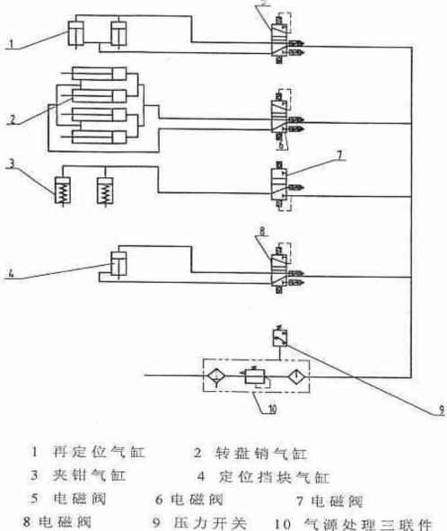 轉(zhuǎn)盤的上、下兩個定位銷分別由兩個汽缸通過聯(lián)接板與銷子相連,氣缸支持在固定座上,由雙電控二位五通閥控制銷子的進(jìn)退,定位時的速度可由單向節(jié)流閥調(diào)整。