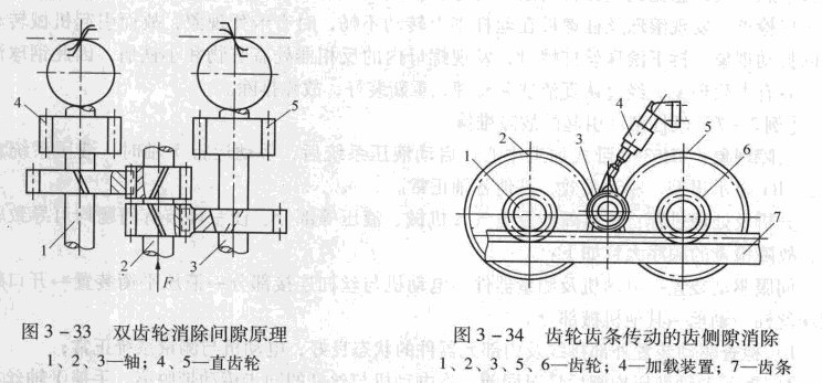 實現(xiàn)(滾珠絲杠只能用在1~6m的傳動中),因太長的絲杠易于下垂,將影響到它的螺距精度及工作性能,此外,其扭轉剛度也相應萬降,故常用窗輪齒條傳動。當驅動負載小時,可采用雙片薄齒輪錯齒調整法,分別與齒條齒槽左、右制貼緊,從而消除齒側隙。因3 -33所示是這種消除間隙方法的原理。進給運動由軸2輸入,通過兩對斜窗輪將運動傳給軸1 和軸3,然后由兩個直齒輪4和5去傳動齒條,帶動工作臺移動,軸2上兩個斜齒輪的螺旋線方向相反。如果通過彈簧在軸2上作用一個軸向力F,則使斜齒輪產(chǎn)生微盤的軸向移動,這時軸l和3便以相反的方向轉過微小的角度,使齒輪4和5分別與齒條的兩齒面貼緊,消除了間隙。當驅動負載大時,采用徑向加載法消除間隙。如圖3 -34所示,兩個小齒輪1和6分別與齒條7啃合,并用加載裝置4在齒輪3上預加負載,于是齒輪3使咱合的大齒輪2和5向外伸開,與其同軸上的齒輪1、6也同時向外伸開,與齒條7上齒槽的左、有兩側相應貼緊而無間隙。齒輪3由液壓馬達直接驅動。