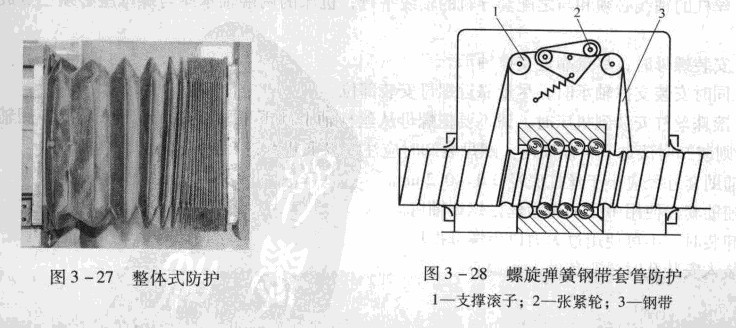 圖3 -28中防護(hù)裝置和蝶母一起固定在拖板上,整個(gè)裝置由支承滾子1、張緊輪2和鋼帶3等零件組成。鋼帶的兩端分別固定在絲杠的外圓表面。防護(hù)裝置中的鋼帶繞過支承滾子,并靠彈簧和張緊輪將鋼帶張緊。當(dāng)絲杠旋轉(zhuǎn)時(shí),工作臺(或拖板)相對絲杠作軸向移動(dòng),絲杠一端的鋼帶按絲杠的螺距被放開,而另一端則以同樣的螺距將鋼帶纏卷在絲杠上。由于鋼帶的寬度正好等于絲杠的螺距,因此蝶紋槽被嚴(yán)密地封住。還因?yàn)殇搸У恼疵媸冀K不接觸,鋼帶外表團(tuán)蒙古附的臟物就不會被帶到內(nèi)表面去,使內(nèi)表面保持清潔。這是其他防護(hù)裝置很難做到的。