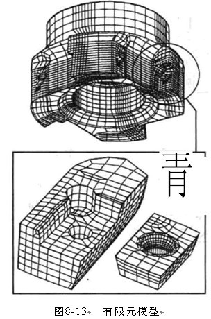 對于數(shù)控沖床機夾可轉(zhuǎn)位刀片鏡刀的安全性,除了刀體的強度外,還有零件、刀片夾緊的可靠性。為了能在設計階段對刀具的結構強度在離心力作用下受力和變形情況進行定性和定量的分析,可通過有限元方法計算不同轉(zhuǎn)速下應力大小,模擬失效過程和改進設計方案。有限元模型包括如圖8-13所示的刀體與刀片座、刀片、夾緊螺釘三部分。首先計算刀體(包括螺釘、刀片等零件的質(zhì))的純彈性變形,接著對分離出來的刀座做詳細的分析,把前面獲得的刀體彈性變形作為邊界條件加到刀座分離體上。然后由切出的刀座、刀片、螺釘及無質(zhì)量的摩擦劇組成了刀片夾緊系統(tǒng)的模型,進行夾緊的可靠性分析。有限元模型能模擬刀片在刀座里的傾斜、滑動、轉(zhuǎn)動,以及螺釘在夾緊時的變形,可計算在不同轉(zhuǎn)速下的刀片位移和螺釘受力大才根據(jù)計算和試驗,機夾可轉(zhuǎn)位恍刀在高速下的失效。