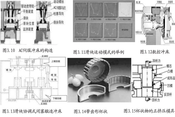 伺服工作機(jī)(圖3.10)是使用AC伺服馬達(dá)通過螺桿驅(qū)動(dòng)滑塊的,成形中下死點(diǎn)的位置可通過位置讀取裝置提供數(shù)據(jù)給位置控置裝置進(jìn)行控制。因此,機(jī)械的熱膨漲和彈性變形不會(huì)影響產(chǎn)品的精度,如圖3.11所示可以調(diào)整出最適合的滑塊運(yùn)動(dòng)方式及以極其微小的單位控制下死點(diǎn)的位置。所以適用于高精度高機(jī)能的無(wú)切削成形螺桿式伺服沖床采用油壓馬達(dá)和儲(chǔ)能器進(jìn)行扭矩控制的形式,下死點(diǎn)的位置控制可達(dá)到微米級(jí),是節(jié)省能源且有環(huán)保要求的機(jī)種。