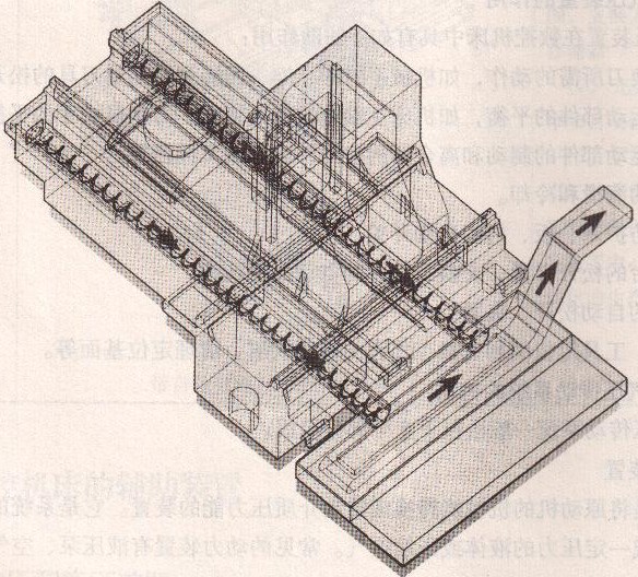 該裝置是利用電機(jī)經(jīng)減速裝置驅(qū)動(dòng)安裝在溝槽中的一根絞籠式螺旋桿進(jìn)行工作的,如圖2 40(c)所示。螺旋桿工作時(shí),溝槽中的切屑由螺旋桿推動(dòng)連續(xù)向前運(yùn)動(dòng),最終排人切屑收集箱。這種裝置占據(jù)空間小,使用時(shí)可安裝在機(jī)床與立柱間間隙狹小的位置上。螺旋槽排屑結(jié)構(gòu)簡(jiǎn)單、性能良好,但只適合滑水平或小角度傾斜的直線運(yùn)動(dòng)排屑,不能大角度傾斜提升和轉(zhuǎn)向排屑。