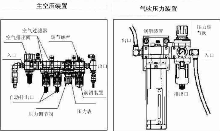 通過位于空氣過濾器底部的排出閥門來排出氣吹裝置的積水。而主空壓裝置的積水是自動排出的
