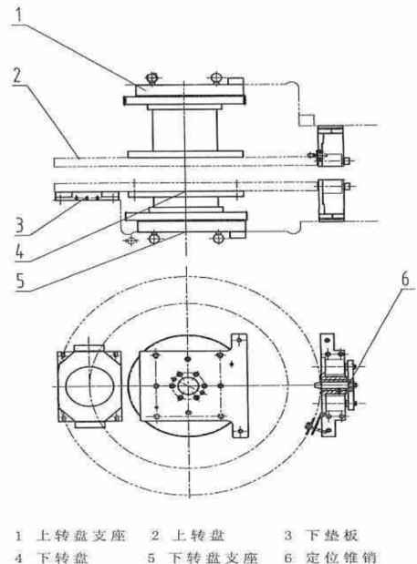 機(jī)器的上、轉(zhuǎn)盤位于機(jī)身的喉口里面,是由圓錐滾子軸承支撐其旋轉(zhuǎn)。凸模和凹模分別裝在上、下轉(zhuǎn)盤上,各定位銷孔分布在圓周上。該部分由AC伺服電機(jī)、定位銷和定位氣缸、減速器等組成。根據(jù)CNC指令,模具要換位時,轉(zhuǎn)盤的定位銷退出,AC伺服電機(jī)驅(qū)動轉(zhuǎn)盤到CNCziling要求的下一個模位,當(dāng)轉(zhuǎn)到新的指令位置時,電機(jī)停下,轉(zhuǎn)盤定位銷插入,保證了模具的精度定位。如圖4.3所示,電機(jī)、減速箱及傳動軸與床身固定。