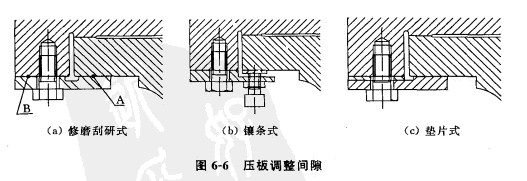 (1)壓板調(diào)整間隙。圖6-6所示為矩形導(dǎo)軌上常用的幾種壓扳裝置。壓板用螺釘固定在動(dòng)導(dǎo)軌上,常用鉗工配合刮研及選用調(diào)整墊片、平鑲條等機(jī)構(gòu),使導(dǎo)軌面與支承面之間的問(wèn)隙均勻,達(dá)到規(guī)定的接觸點(diǎn)數(shù)。對(duì)因6-6 (a)所示的壓板結(jié)構(gòu),如間隙過(guò)大,應(yīng)修磨和刮研B面;間隙過(guò)小或壓板與導(dǎo)軌壓得太緊,則可研或修磨A面;圖6-6(b)所示的是采用鑲條式調(diào)整間隙5圖6-6 (c)所示的是采用墊片式 調(diào)整間隙。