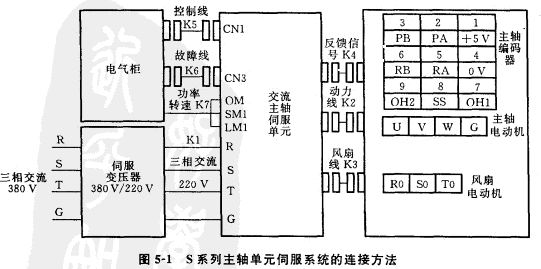 例如,F(xiàn)ANUCS系列主制1單元伺服系統(tǒng)的基本配。S系列主輸單元伺版系統(tǒng)的連接方法如圖5-1所示。其中K1為從變壓根副邊輸出的AC200V的三相電源電纜。應(yīng)接到數(shù)控沖床的主軸伺服單元的R、S、T和G端。 K2為從主軸單元的U、V、W和G蝙輸出到電動(dòng)機(jī)的動(dòng)力線,應(yīng)與t牽線盒內(nèi)的指示相符。 K3為主軸伺服單元的編 子T上的RO、SO和TO輸出到主軸風(fēng)扇電動(dòng)機(jī)的動(dòng)力線,應(yīng)使風(fēng)扇向外排風(fēng)。 K4為主輸電動(dòng)機(jī)的編碼稽反饋電纜,其中PA、PB、RA、RB用微速度反饋信號(hào),OHI,OH2為電動(dòng)機(jī)的溫控開關(guān)按點(diǎn),SS為屏蔽線。 K5為從NC和PMC輸出到主軸 伺lit單元的控制信號(hào)電纜,接到主軸伺版單元的50芯捕座CNl。K6電纜從主軸伺跟單元的20芯插鹿CN3輸出主輸故障識(shí)JlIJ信號(hào)。該信號(hào)由AL8、AU、AL2、ALl以及COM組成,由它們產(chǎn)生的16種二進(jìn)制狀態(tài)表示相應(yīng)的故障類型,這些信號(hào)選人PMC后,囪相應(yīng)的譯碼程序處理后顯示在CRT上。